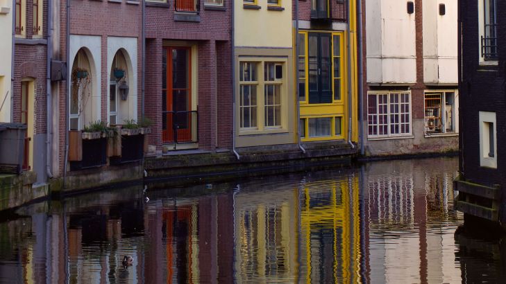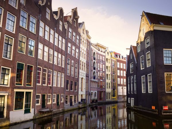 Domy w Amsterdamie na kanale w różnych materiałach