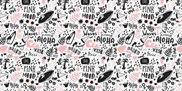 Wzór z ikonami doodle i napisami. Obejmuje deski surfingowe, palmy i arbuzy.