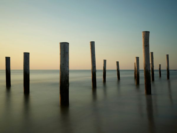 Drewniane słupki na plaży o zachodzie słońca.