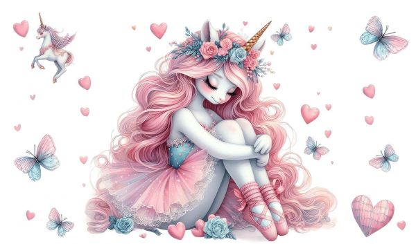 Elegancki jednorożec z falującymi różowymi grzywami i czarującą tutu emanuje spokojem i gracją. Otoczony motylami, sercami i kwiatami w delikatnych pastelowych odcieniach, ten projekt tworzy bajkową i romantyczną atmosferę.