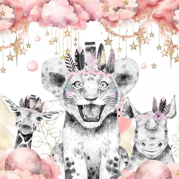 Zabawny lwiak, ciekawska żyrafa i wesoły nosorożec stoją razem pod magicznym niebem pełnym różowych chmur i migoczących gwiazd. Połączenie czarno-białych ilustracji z delikatnymi pastelowymi odcieniami i złotymi akcentami nadaje temu projektowi marzycielski i fantazyjny wygląd.