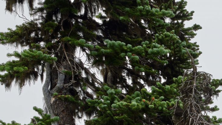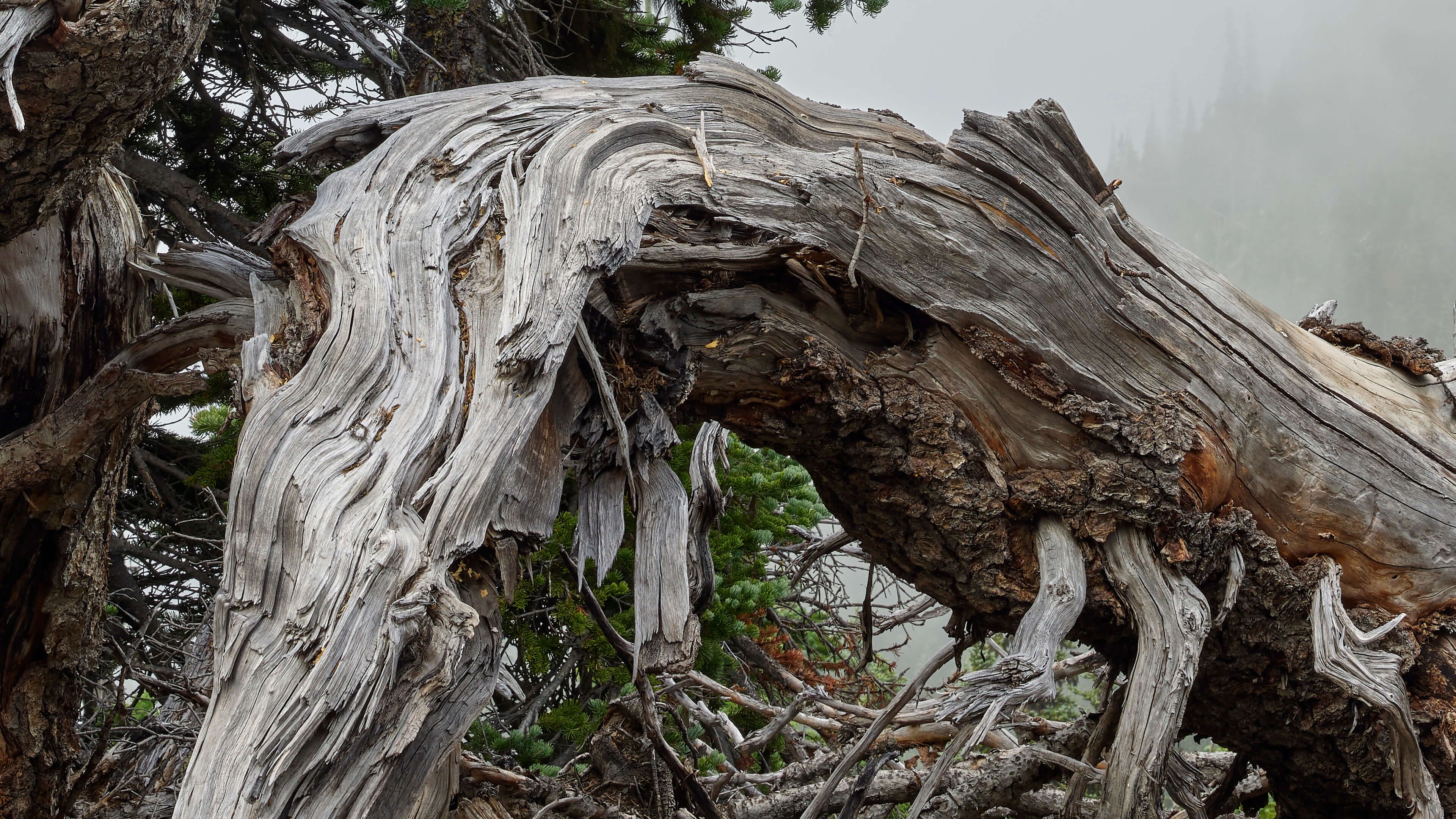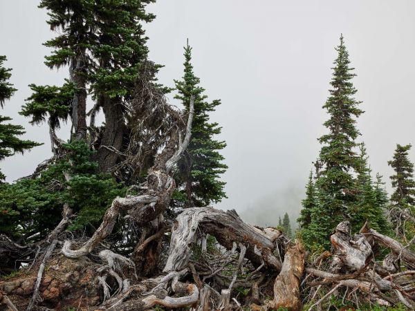 Górski krajobraz leśny z drzewami i starymi drzewami na pierwszym planie.