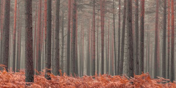 Drzewa na wzgórzu podczas jesieni. Na pierwszym planie znajdują się pomarańczowo zabarwione jesienne paprocie.