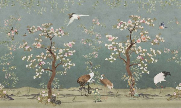 Eleganckie żurawie i kolorowe ptaki poruszają się między kwitnącymi drzewami na tle błękitno-zielonym. Scena emanuje spokojem i wyrafinowaniem, z kwiatowymi detalami i delikatnymi naturalnymi odcieniami.