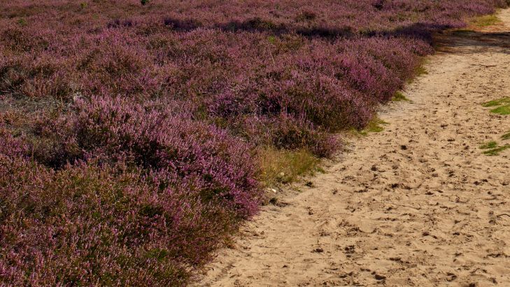 Drzewo wzdłuż piaszczystej ścieżki na wrzosowiskach. Zabierzcie wrzosowisko do domu z tą fototapetą.