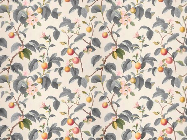 Delikatne gałęzie z okrągłymi owocami w ciepłych odcieniach czerwieni i żółci są łączone z delikatnymi różowymi kwiatami i eleganckimi szaro-niebieskimi liśćmi. Jasne tło i powtarzający się wzór nadają całości spokojny, klasyczny i wyrafinowany wygląd.
