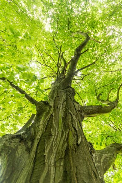 Zdjęcie portretowe dużego drzewa w lesie z jasnozielonymi liśćmi.