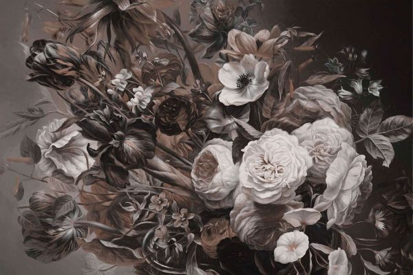 Elegancka i nostalgiczna dekoracja kwiatowa w ciepłych odcieniach sepii i kremu, w której spotykają się bujne róże i ciemne tulipany. Głębokie cienie i subtelne światło nadają temu wzorowi klasyczny, ponadczasowy wygląd, idealny do stylowego i nastrojowego wnętrza.