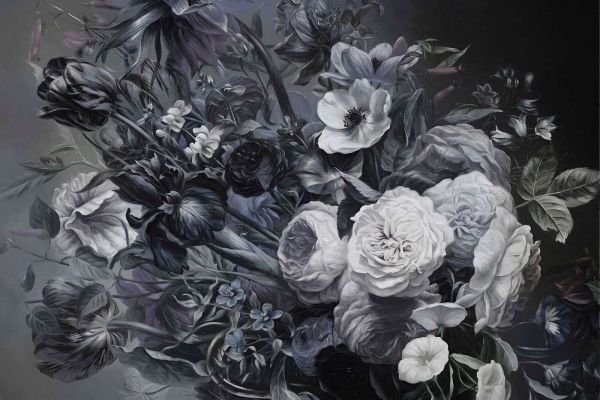 To imponujące wzornictwo uchwyca atmosferę królewskiego malowidła kwiatowego z wyrafinowaną paletą nocnego niebieskiego, szarości i odcieni kremowych. Ciemne tulipany i anemony wspaniale kontrastują z delikatnymi białymi różami, tworząc głęboki i dramatyczny efekt. Subtelne pociągnięcia pędzla i nastrojowe cienie nadają całości klasyczny i tajemniczy wygląd, idealny do wnętrza, które emanuje luksusem i elegancją.