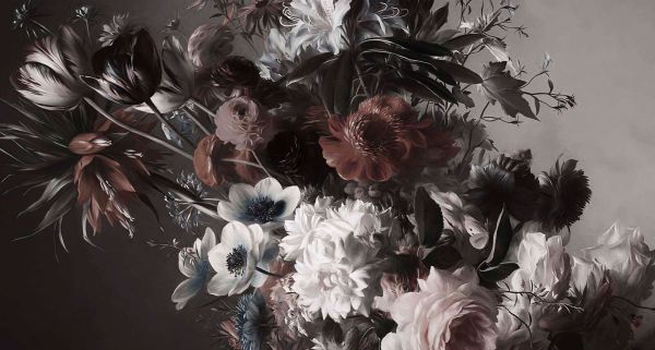 To imponujące kwiatowe motywy uchwycają atmosferę klasycznego martwego natury, z bogatą kompozycją tulipanów, róż, anemonów i innych wyrafinowanych kwiatów. Głębokie odcienie rdzawego brązu, nocnego niebieskiego i kości słoniowej są podkreślone przez cienistą tło, co nadaje kwiatom niemal namacalną głębię. Stonowane kolory i dramatyczne światło nadają temu projektowi barokowy, ponadczasowy wygląd, który jest zarówno luksusowy, jak i tajemniczy.