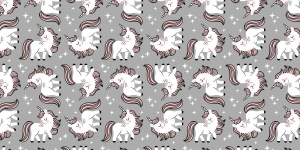 Wzór z białych jednorożców dzieci z różowymi grzywami na szarym tle.