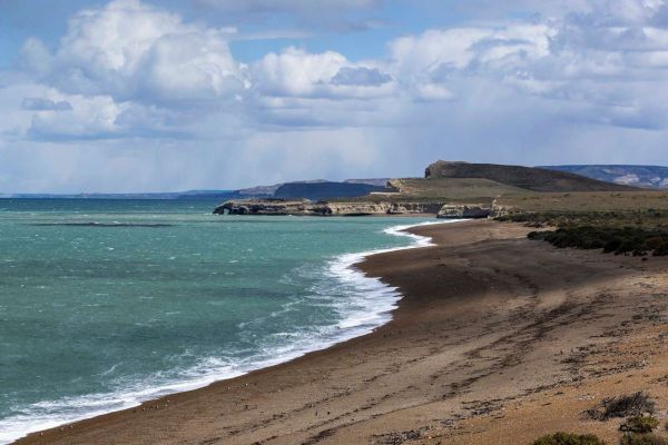 Imponujący krajobraz nadmorski z ciemnymi piaszczystymi plażami, stromymi klifami i dziką błękitno-zieloną wodą morską pod zachmurzonym niebem.