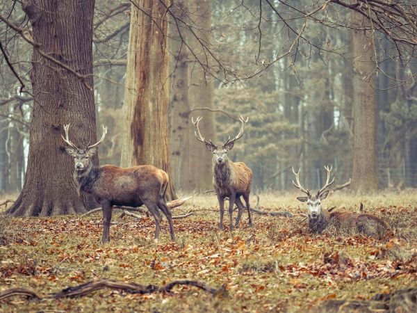 Dzikie jelenie w spokojnym rezerwacie przyrody. Wszystkie trzy jelenie patrzą w tym samym kierunku.
