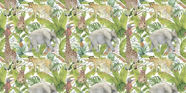 Kolorowy wzór z akwareli dzikich zwierząt egzotycznych, liści palmowych, roślin, ananasów i liści bananowca.