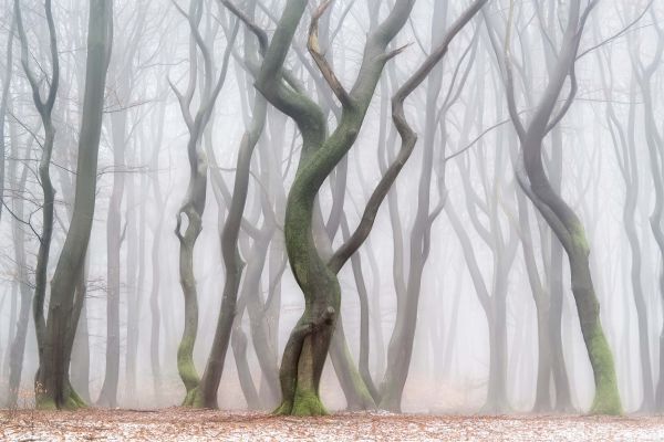 Mglisty i senny las z drzewami skręcającymi jesienią.