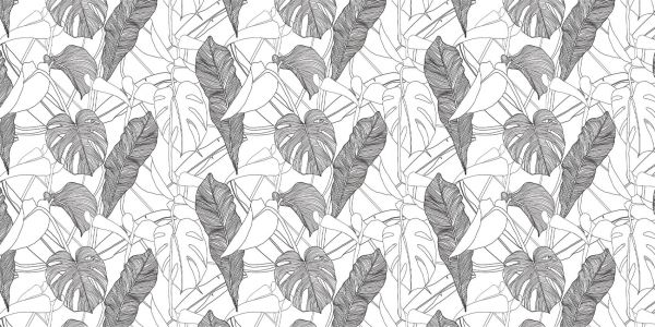 Biała tapeta z wzorem pełnym egzotycznych roślin w cienkich liniach.