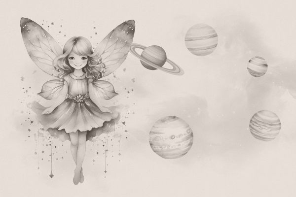 Rozmarzona wróżka unosi się między planetami i mgławicami gwiazdnymi w delikatnych odcieniach szarości. Połączenie przestrzeni i fantazji nadaje całości spokojny, magiczny wygląd.