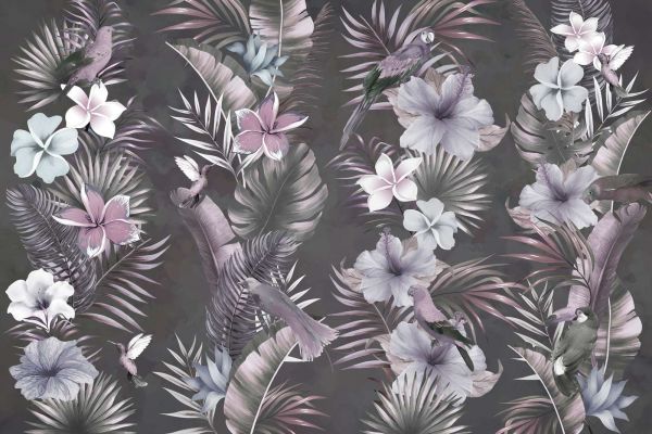 Una fusión exótica de flores vibrantes y hojas tropicales, con elegantes pájaros y colibríes que crean una atmósfera serena. Los suaves colores pastel realzan la sensación de tranquilidad y elegancia.