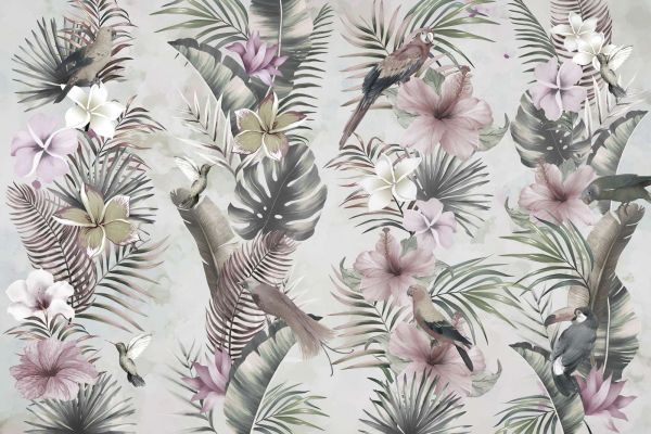 Una fusión exótica de flores vibrantes y hojas tropicales, con elegantes pájaros y colibríes que crean una atmósfera serena. Los suaves colores pastel realzan la sensación de tranquilidad y elegancia.