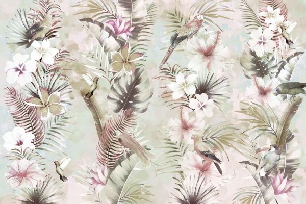 Una fusión exótica de flores vibrantes y hojas tropicales, con elegantes pájaros y colibríes que crean una atmósfera serena. Los suaves colores pastel realzan la sensación de tranquilidad y elegancia.