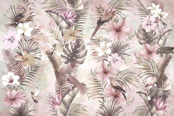 Una fusión exótica de flores vibrantes y hojas tropicales, con elegantes pájaros y colibríes que crean una atmósfera serena. Los suaves colores pastel realzan la sensación de tranquilidad y elegancia.
