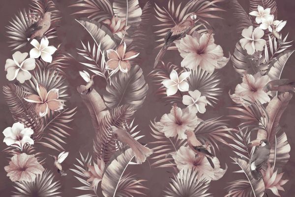 Una fusión exótica de flores vibrantes y hojas tropicales, con elegantes pájaros y colibríes que crean una atmósfera serena. Los suaves colores pastel realzan la sensación de tranquilidad y elegancia.
