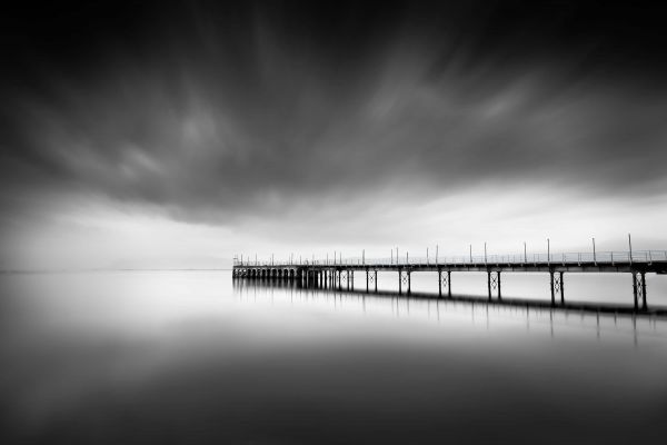 Długie molo rozciągające się daleko nad wodą. Zdjęcie ma świetny kontrast pomiędzy ciemnymi i jasnymi częściami zdjęcia.