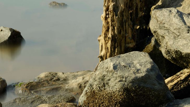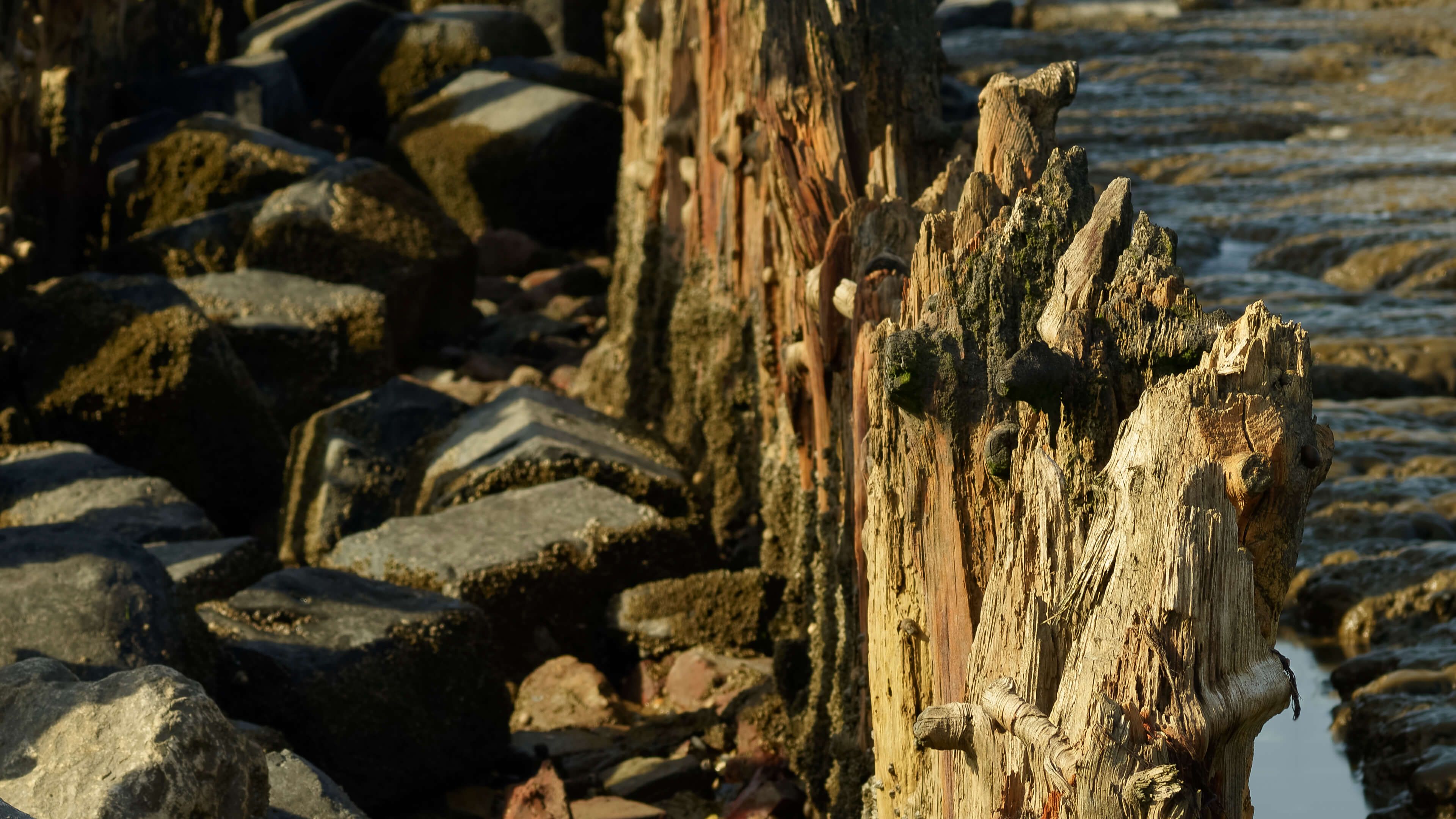 Falochron z drewna i kamienia z pięknym niebieskim niebem w tle.