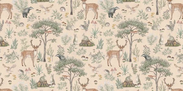 Magiczny leśny wzór z detalicznymi zwierzętami takimi jak jelenie, króliki, borsuki i sowy, otoczony drzewami, krzewami i grzybami. Vintage kolor tła tworzy bajkową, spokojną atmosferę, idealną do dodania czarującego akcentu w każdej przestrzeni.