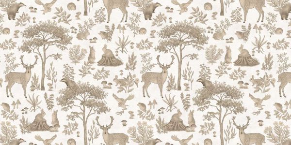 Magiczny leśny wzór z detalicznymi zwierzętami takimi jak jelenie, króliki, borsuki i sowy, otoczony drzewami, krzewami i grzybami. Vintage kolor tła tworzy bajkową, spokojną atmosferę, idealną do dodania czarującego akcentu w każdej przestrzeni.