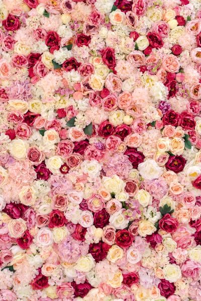 Zdjęcie pełne róż w różnych rozmiarach i kolorach.