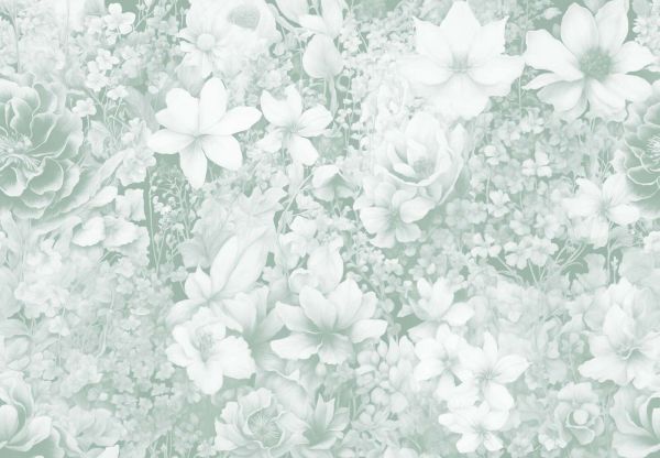 Delikatny motyw kwiatowy z białymi i jasnoniebieskimi kwiatami, flankowany przez jasnozielone liście. Blada, pastelowa niebieska tło tworzy chłodną i spokojną atmosferę. Subtelne odcienie w płatkach kwiatów nadają całości delikatny i wyrafinowany charakter.
