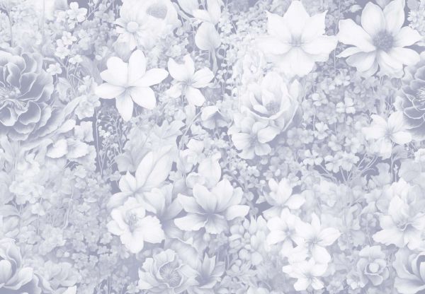 Szykowny kwiatowy wzór z białymi i lawendowymi kwiatami, delikatnie otoczony szaro-zielonymi liśćmi. Jasnofioletowe tło wzmacnia uspokajający, niemal aromatyczny wygląd. Delikatne płatki kwiatów tworzą spokojny i czarujący obraz całości.