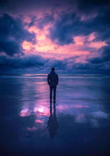 Sylwetka stoi nieruchomo na mokrej plaży, otoczona głębokimi fioletowoniebieskimi odcieniami i dramatycznym, rozświetlającym się wieczornym niebem. Odbicie nieba w wodzie wzmacnia uczucie spokoju i samotności.