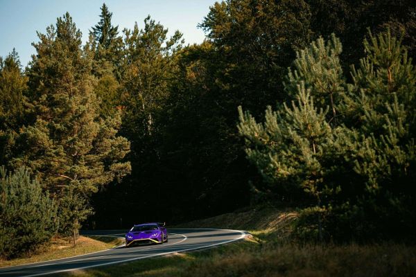 Fioletowe Lamborghini Huracán toruje sobie drogę przez krętą leśną trasę, otoczone bujnymi zielonymi sosnami. Kontrast między żywym kolorem lakieru a naturalnym otoczeniem tworzy unikalny i potężny wygląd, w którym prędkość i natura się łączą.