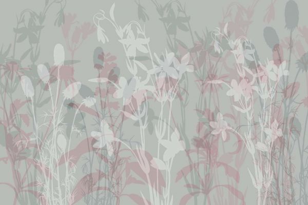 Un refinado juego de sombras florales transparentes en delicados tonos azules sobre un suave fondo gris verdoso. Las elegantes siluetas de flores silvestres crean una composición aireada y relajante que armoniza perfectamente con los entornos naturales.