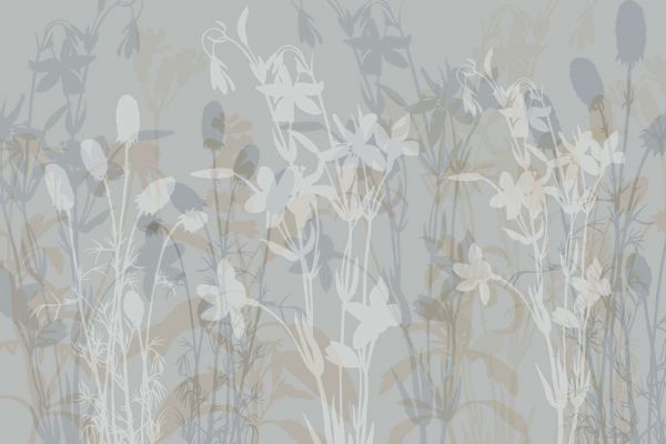Un refinado juego de sombras florales transparentes en delicados tonos azules sobre un suave fondo gris verdoso. Las elegantes siluetas de flores silvestres crean una composición aireada y relajante que armoniza perfectamente con los entornos naturales.