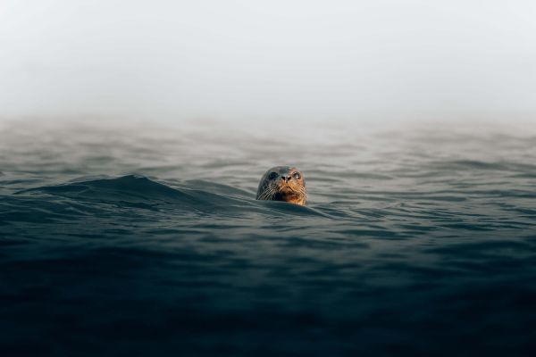Foka u wybrzeży Danii. Przez głowę foki widać, że słońce zachodzi.