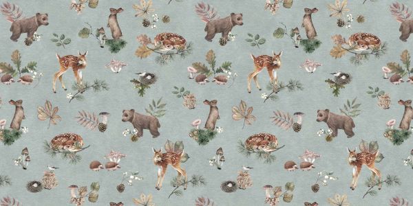 Zaczarowany leśny wzór z figlarnymi zwierzętami, takimi jak jelenie, niedźwiedzie i króliki, otoczony liśćmi, grzybami i innymi leśnymi detalami. Ten delikatny wzór na spokojnym tle przynosi magię lasu do wnętrza, idealny do stworzenia spokojnej i naturalnej atmosfery w każdej przestrzeni.