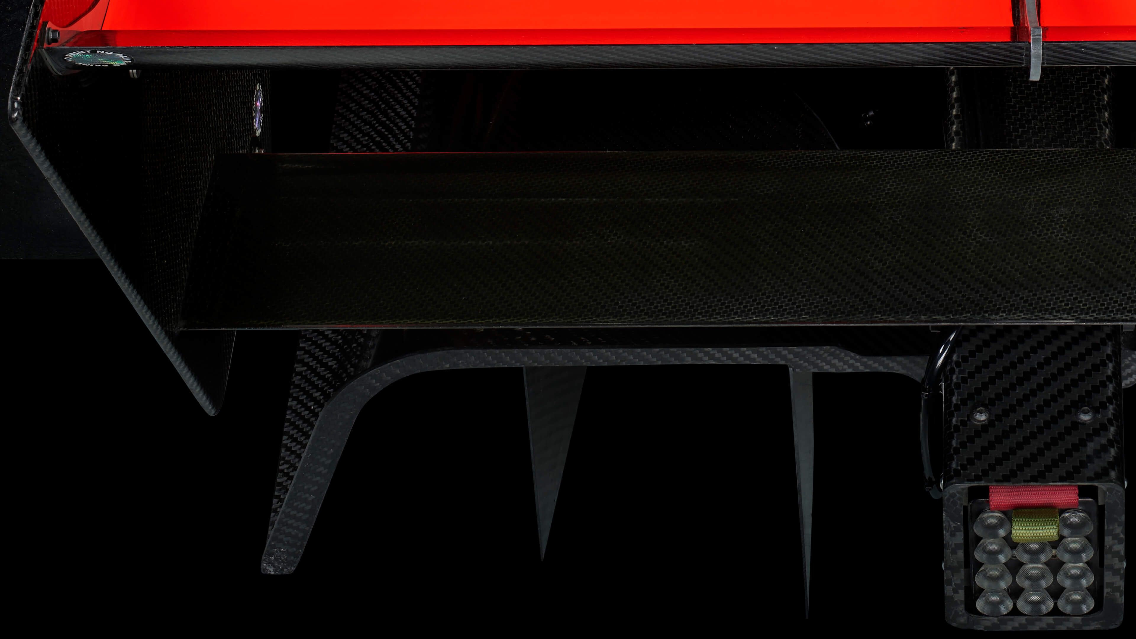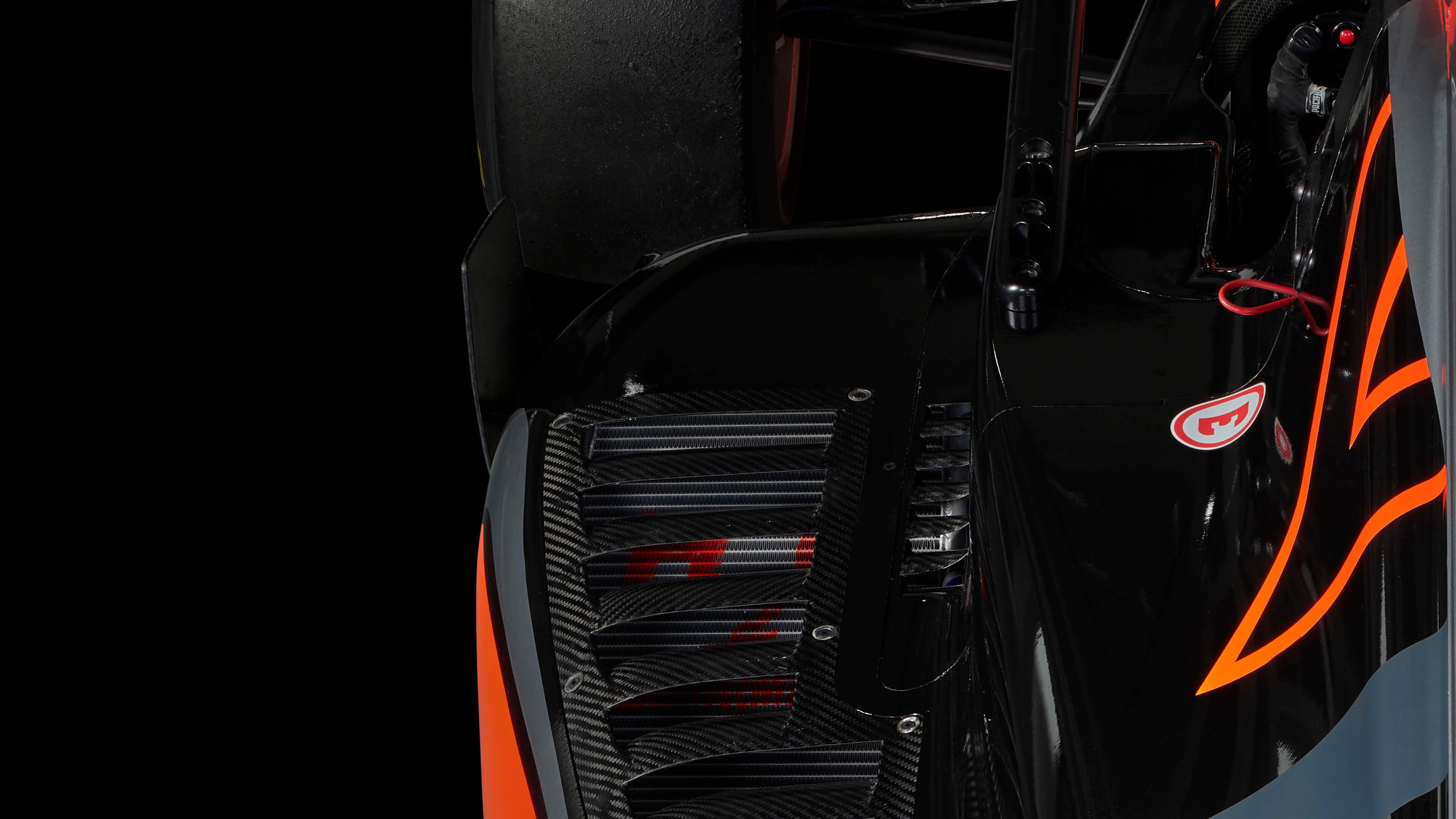 Tył samochodu wyścigowego Formuły 3 w unikalnej wysokiej jakości, z ostrymi detalami, takimi jak kratki wydechowe i wentylacyjne. Nadrukowany na czarnym tle.