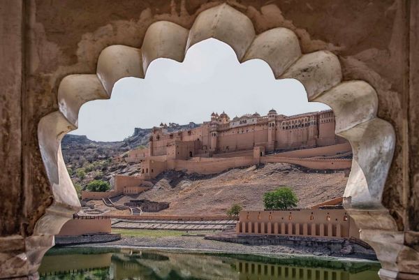 Majestatyczny fort w kolorze piasku wyrasta z jałowego pustynnego krajobrazu, otoczony przez piękne, rzeźbione łuki. Odbicie w spokojnej wodzie nadaje całości spokojny i dostojny wygląd.
