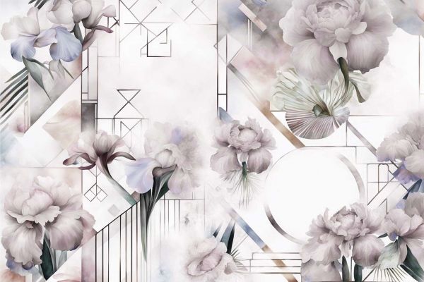 To wyrafinowany projekt łączy delikatne piękno irysów i piwonii z eleganckimi formami stylu Art Deco. Kwiaty, namalowane w miękkiej technice akwarelowej, wydają się niemal zanikać w mglistym tle beżu, szarości i subtelnych pastelowych odcieni. Geometryczne linie i abstrakcyjne kształty dodają struktury i równowagi, tworząc harmonijną mieszankę klasyki i nowoczesności.