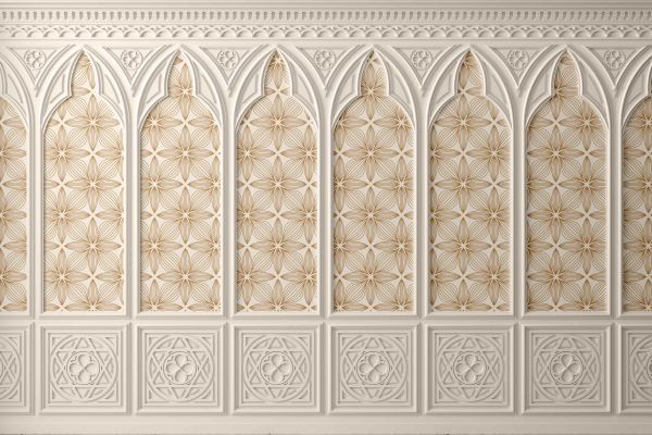 Seria ozdobnych paneli charakteryzujących się wyrafinowanym złotym wzorem na spokojnym białym tle.