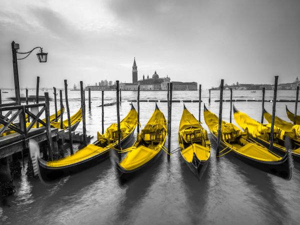 Gondole zacumowane wzdłuż kanału w Wenecji, Włochy. Zdjęcie jest czarno-białe z żółtym efektem nad gondolami.