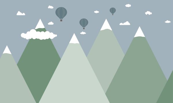 Hip-zielony krajobraz górski z błękitem nieba i trzema balonami na gorące powietrze.