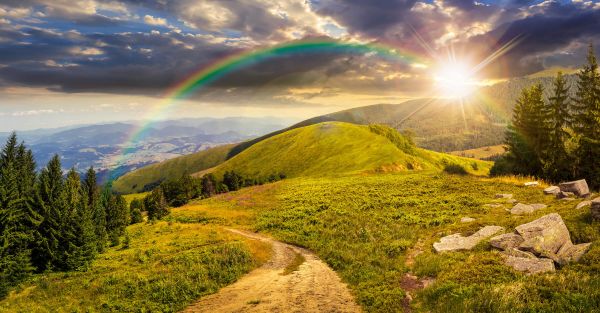 Góry na piękny zachód słońca z tęczą. Z tą fototapetą w Twoim domu jest tak, jakbyś mógł wejść prosto do tego krajobrazu.