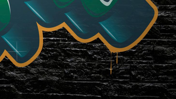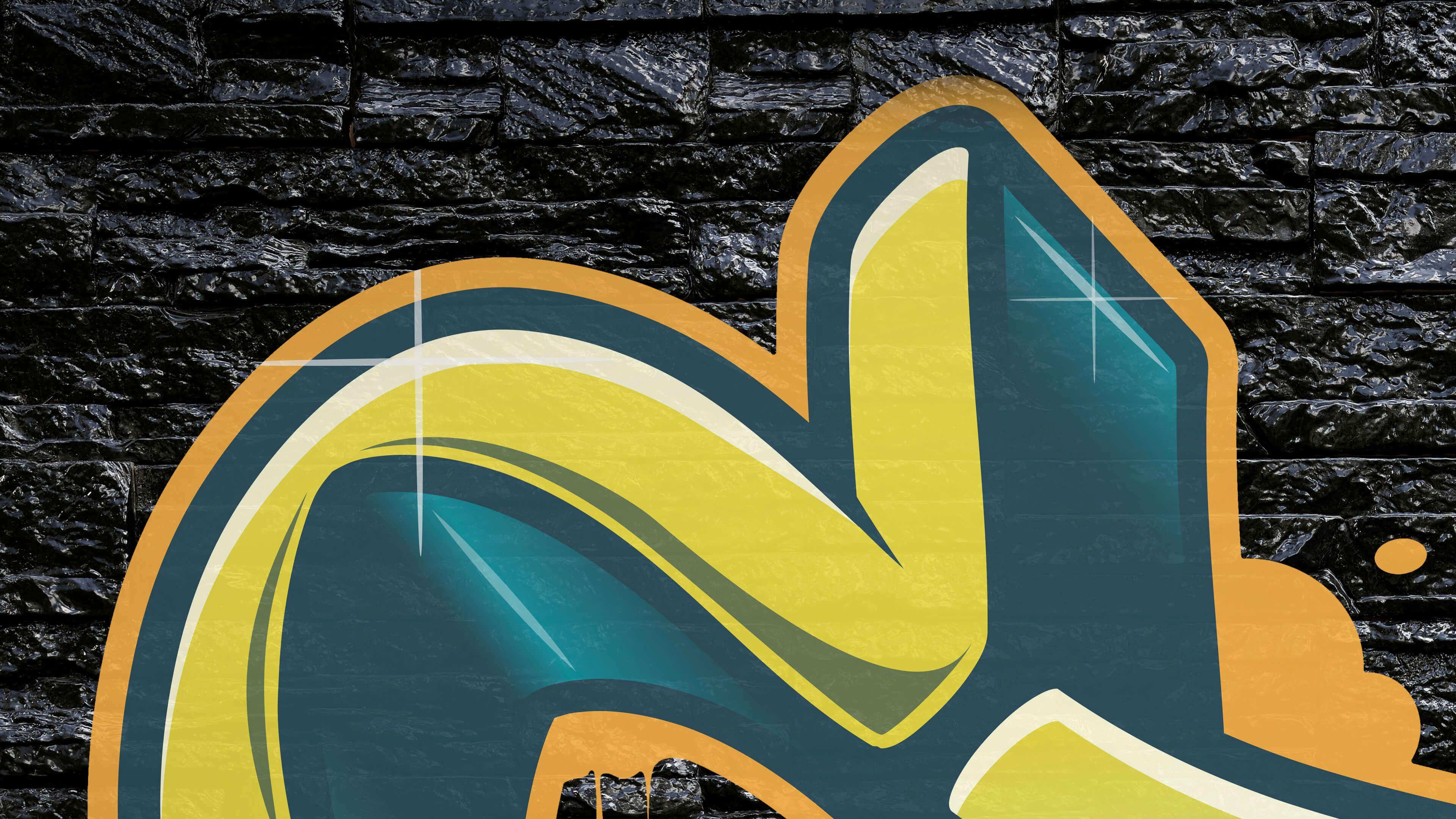 Graffiti na czarnym kamiennym murze. Dzięki czarnym kamieniom graffiti na tej tapecie ładnie się wyróżnia.