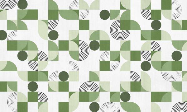 Ten żywy wzór łączy odcienie zieleni z zabawnymi geometrycznymi wzorami. Koła i kwadraty w różnych rozmiarach i odcieniach przeplatają się, niektóre z efektownymi spiralnymi akcentami.