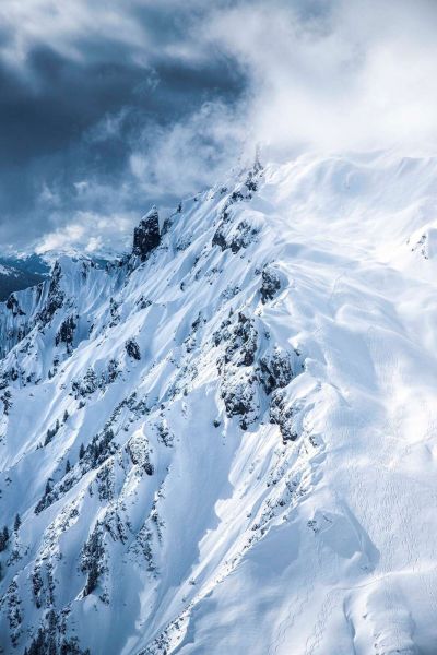 Górzysty i imponujący masyw górski okryty grubymi warstwami śniegu, z groźnymi chmurami nad sobą. Strome zbocza i wyboiste skały tworzą potężny zimowy obraz pełen ruchu i głębi.