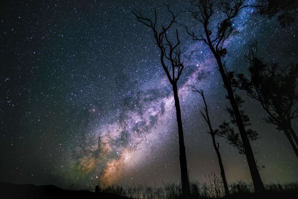 Kolorowe gwiaździste niebo między cienkimi drzewami.